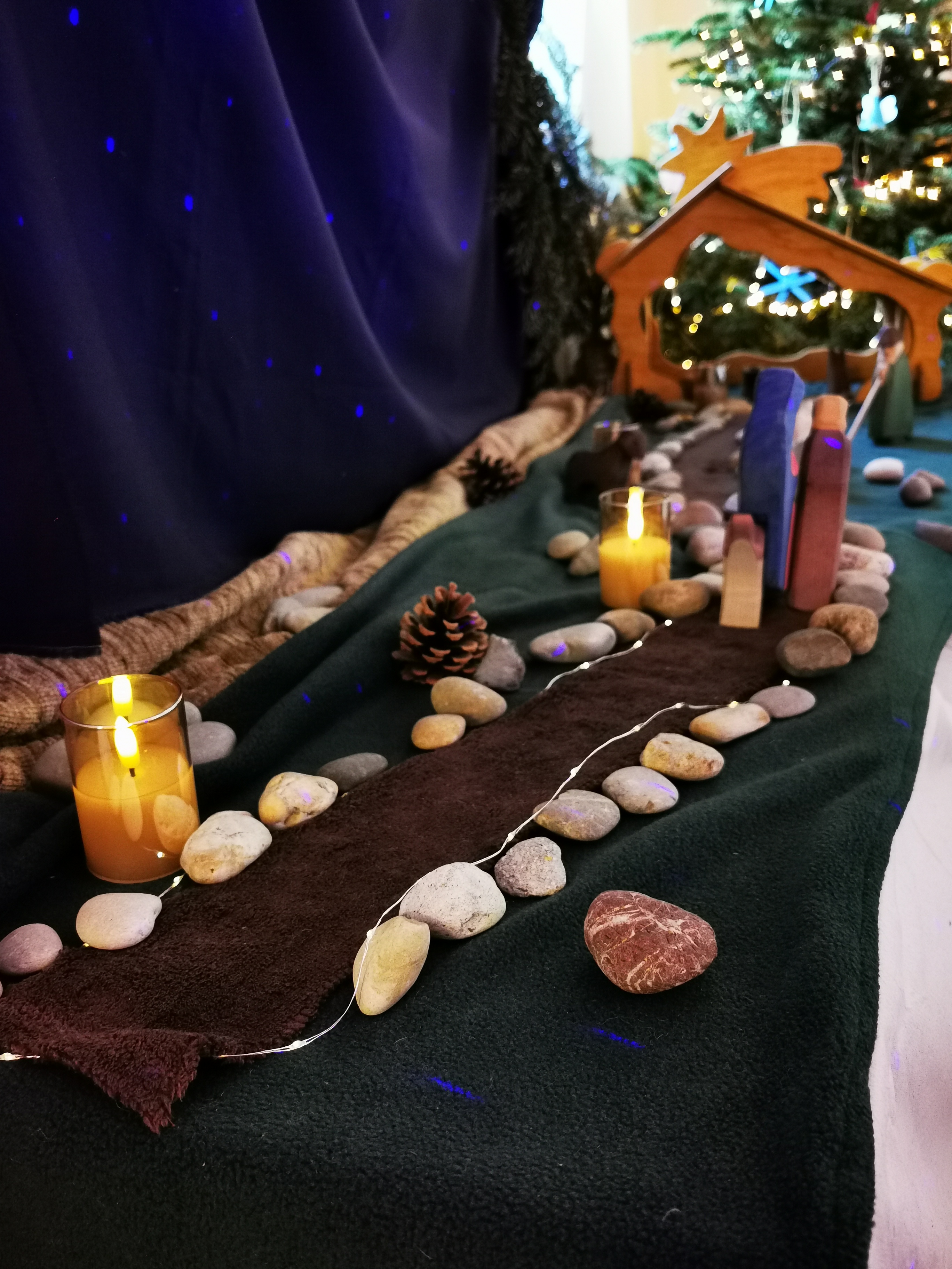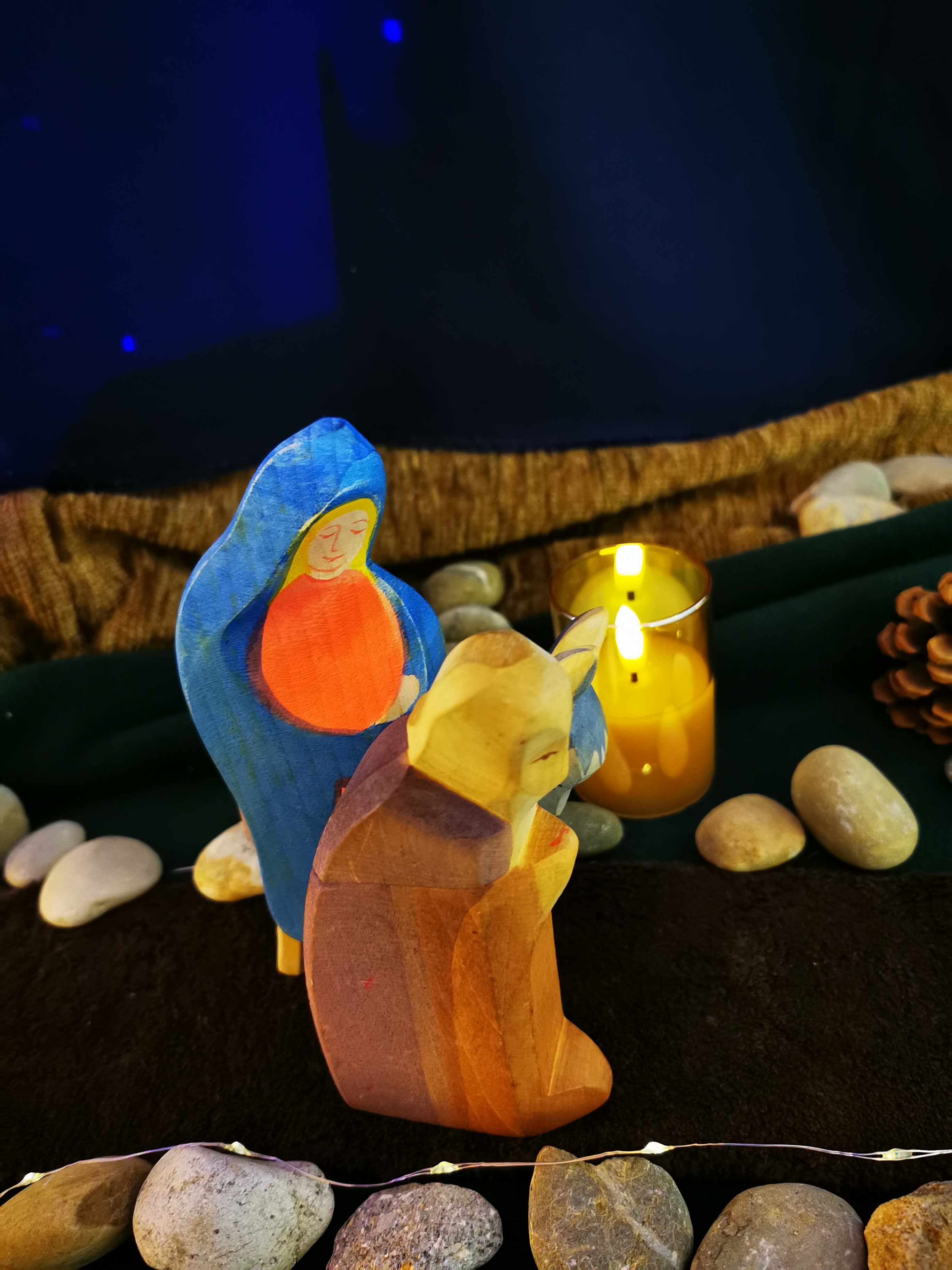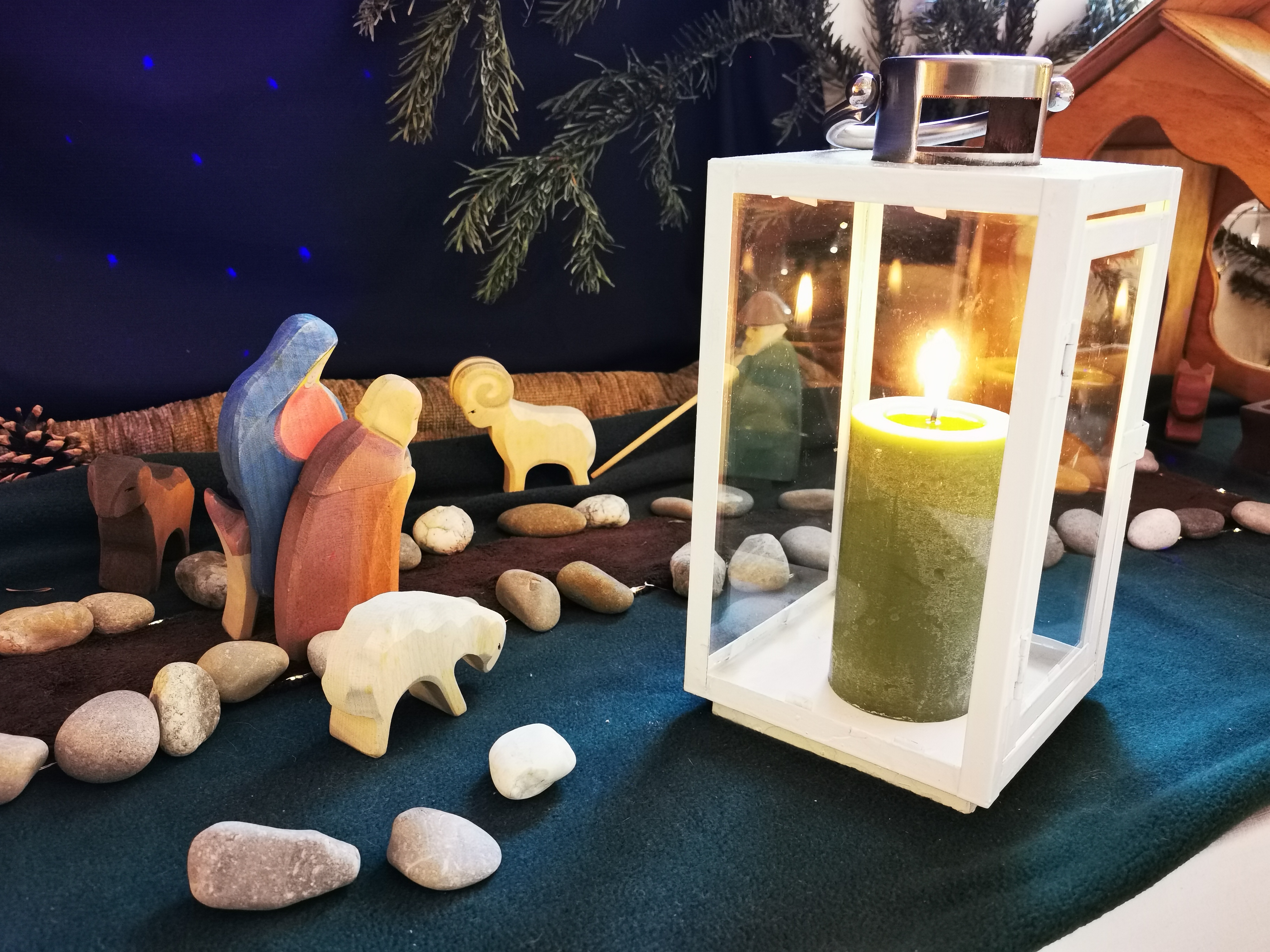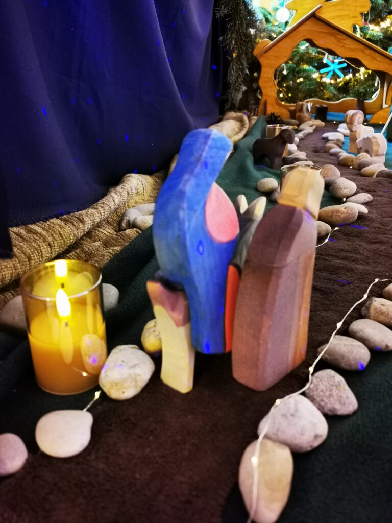 Am 1. Advent hat uns Franziska besucht und mit den Kindern Maria und Josef auf den Weg gebracht. Daneben brennt die 1. Kerze. Jeden Montag wandern die Beiden weiter auf ihrem Weg nach Bethlehem. Dazu singen wir gemeinsam Lieder und beten.