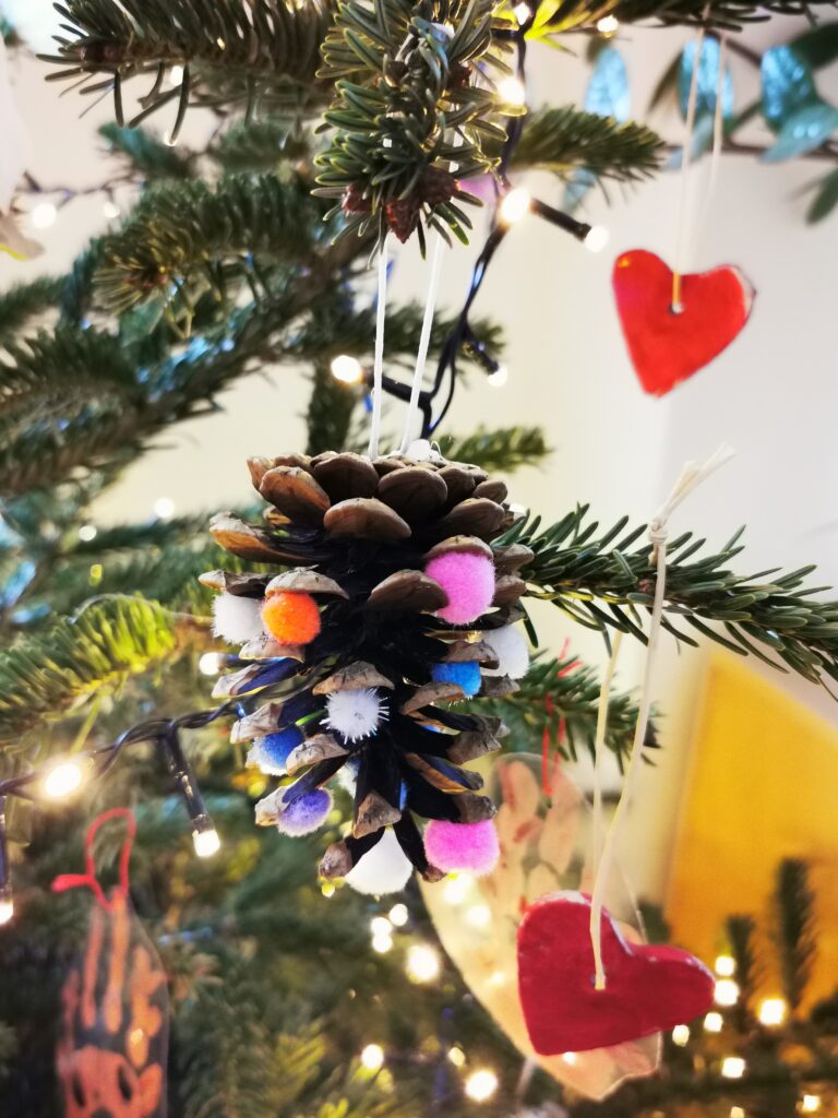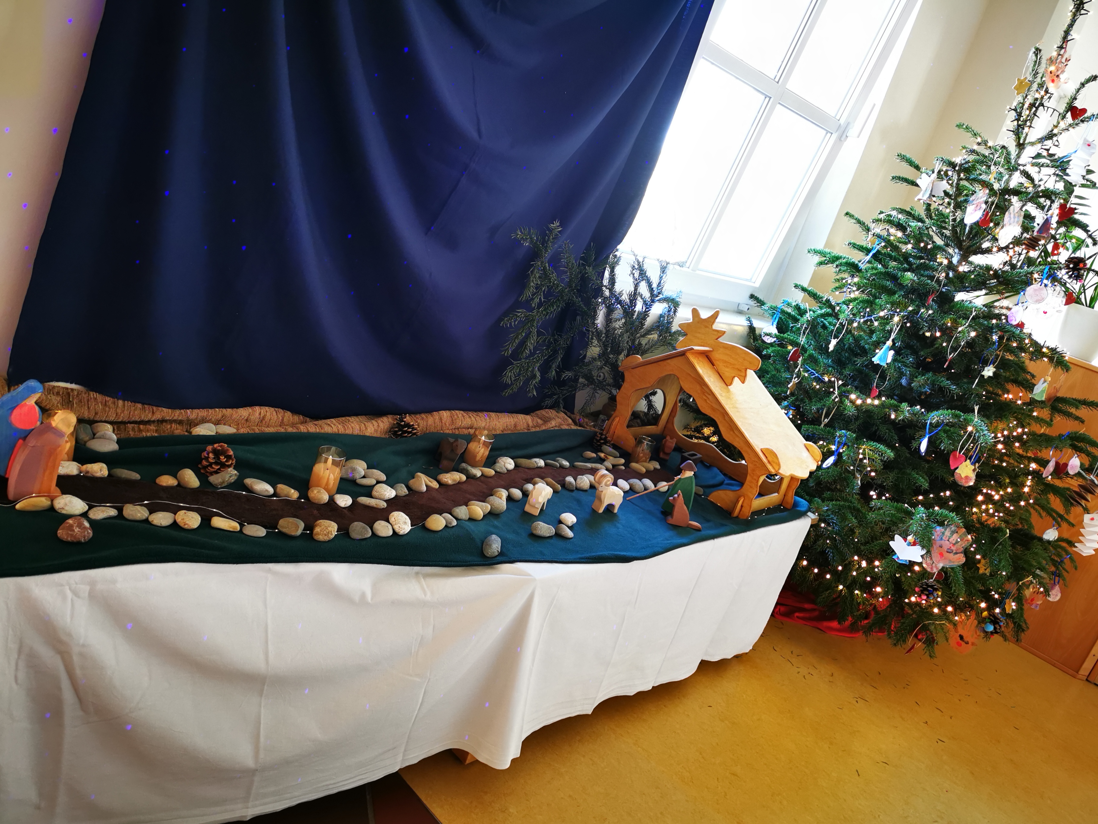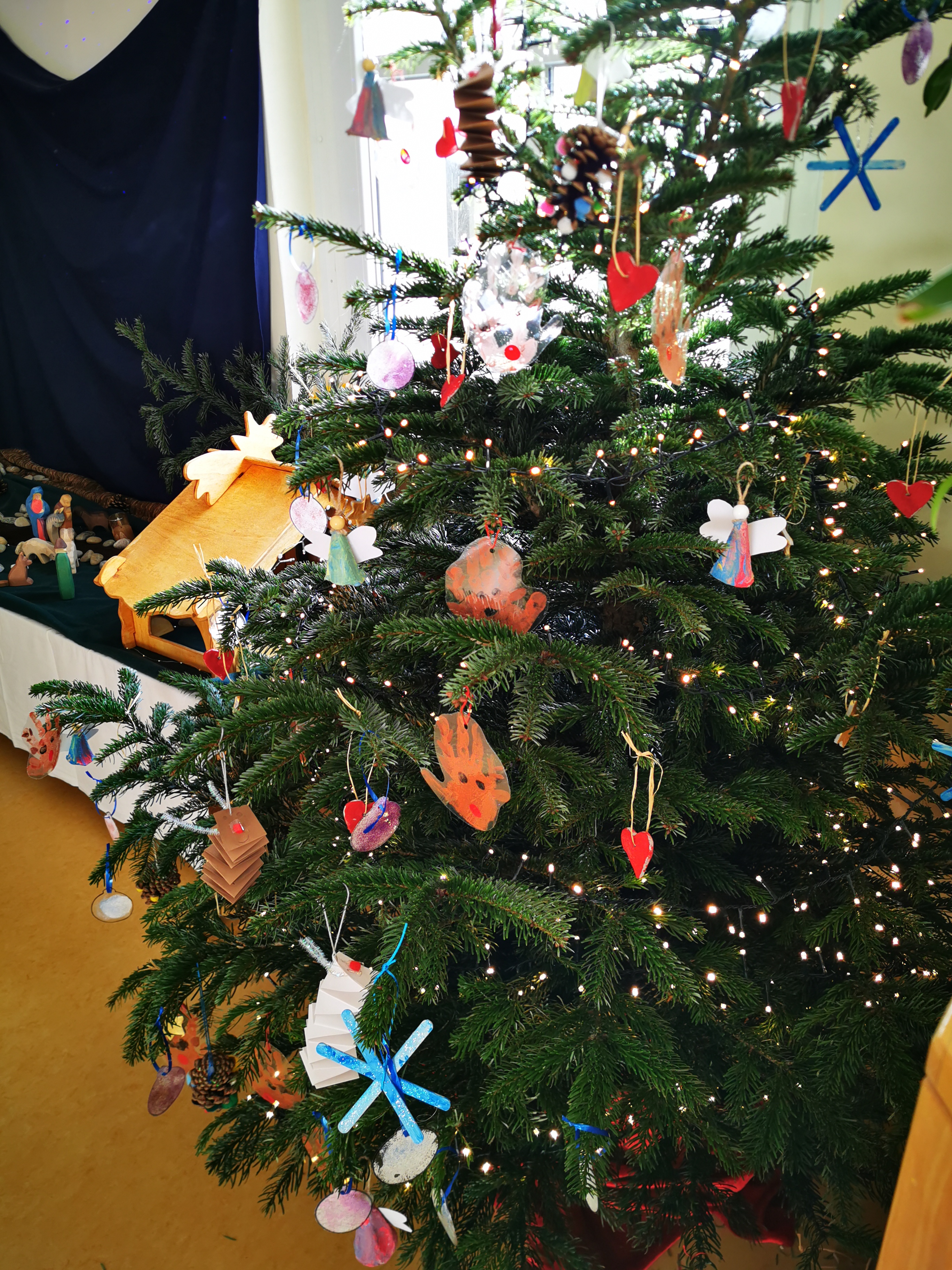 Der Weihnachtsbaum ist von den Kindern schon wunderschön geschmückt worden.
